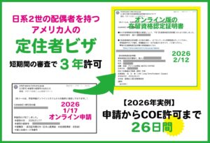 ご依頼者様は、海外に在住(アメリカに在住)したまま、「日本人の実子としての配偶者等ビザ」の申請を2026年1月17日にオンラインで行い、約1カ月という短期間の審査で、在留期間「5年」が許可されました。その理由や必要な書類、注意点について解説します。(あくまで弊所の経験に基づく解説です)